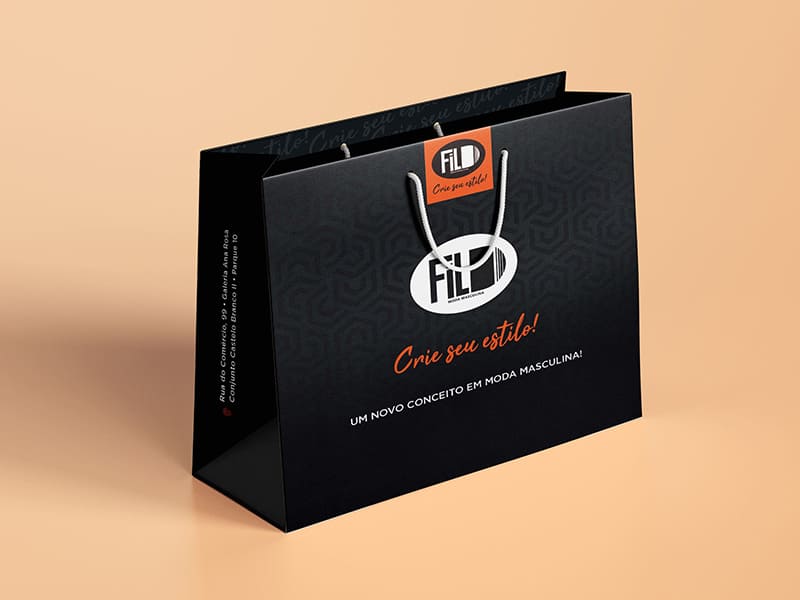 A proprietária da loja solicitou um novo desenho para sua sacola para a nova fase da loja que estava sendo reinaugurada. Juntamente com a sacola ela solicitou etiqueta adesiva para lacrar a parte superior da sacola e também um folder com os contatos da loja e que internamente o cliente pudesse escrever uma dedicatória que seria colocada dentro da sacola com o presente.